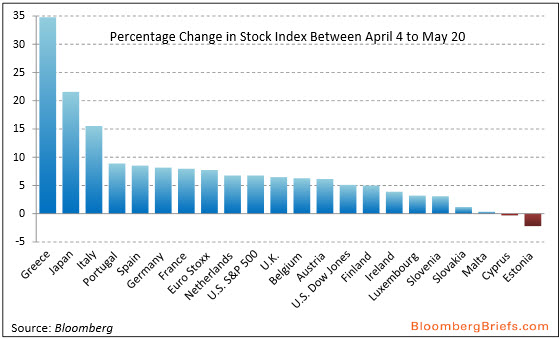Come vi ho spiegato martedì, quello giapponese è un azzardo colossale e fragile, ma capace di schiantare i mercati globali se qualcosa andrà storto. Guardate quest’altro grafico: ci mostra le percentuali di variazione dei vari indici azionari dal 4 aprile al 20 maggio scorsi. Vi rendete conto? Tolti l’Estonia e Cipro hanno tutti guadagnato, Grecia, Giappone e Italia in maniera a dir poco sostanziale. Direte voi, bene no? Sarebbe certamente un bene se questo rally avesse delle basi solide, si reggesse su fondamentali macro: invece si basa su due stamperie clandestine in stile “La banda degli onesti”, ovvero la Fed e la Bank of Japan. E se finissero quei soldi facili? Che randellata di correzione dei corsi e dei prezzi dovremmo aspettarci? Il “black Thursday” è stata una prima risposta.