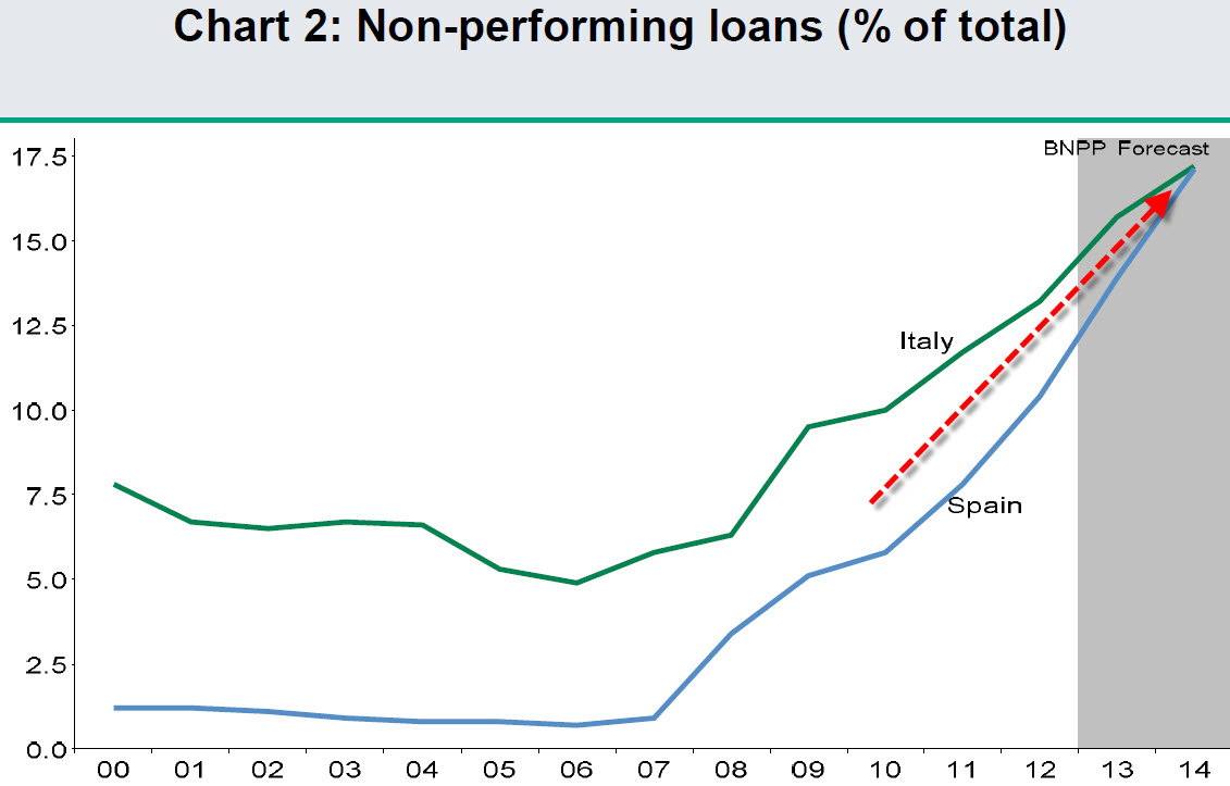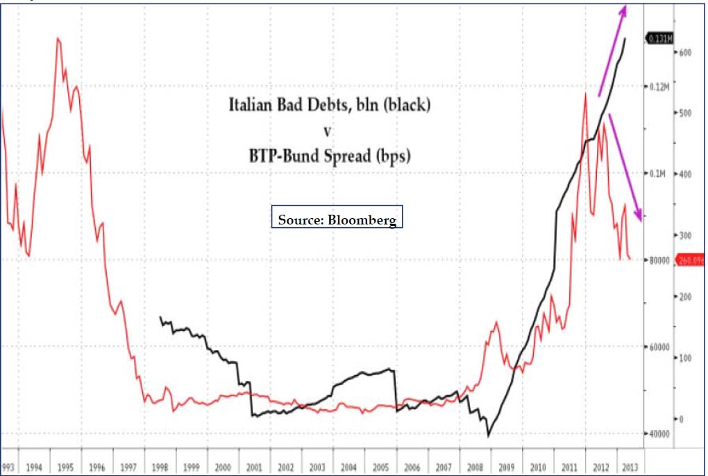 Come mai? Semplice, con un ritardo di 6-8 settimane, dovuto all’esuberanza da ricerca del rendimento che ha drogato i mercati, gli investitori cominciano a prezzare l’aumento delle sofferenze bancarie, tramutando gli istituti di credito europei nel cosiddetto “elefante nella stanza”. Come vedete dal grafico, finora i due andamenti sono stati più o meno regolari, ovvero hanno conosciuto una medesima traiettoria. Poi, da metà del 2012, le traiettorie sono divenute nettamente divergenti: le sofferenze crescevano, lo spread si comprimeva grazie ai soldi della Bce che permettevano alle banche europee di comprare titoli di Stato e alla promessa di Draghi di difendere l’euro a ogni costo (più Fed e Bank of Japan).