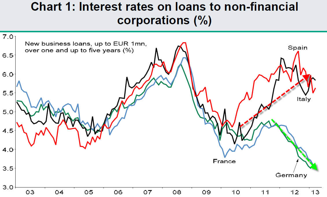 Ora guardate il primo grafico più in basso: ci mostra l’andamento di crescita delle sofferenze bancarie in Italia e Spagna. A un ritmo simile, non se ne esce (e l’ultima parte di questo articolo sarà dedicata a spiegarvi il perché). C’è però anche dell’altro, ovvero quanto spiegato dal secondo grafico: il deterioramento della capacità di finanziamento per le aziende italiane e spagnole rispetto a quelle francesi e tedesche. I tassi d’interesse sui nuovi prestiti, infatti, hanno costi doppi per le nostre Pmi e per quelle iberiche e questo in un contesto che vede l’80% del finanziamento del settore corporate dei due paesi legato proprio al settore bancario, con percentuali che salgono ancora per le piccole e medie aziende. Insomma, la competitività è andata, persa magari non per sempre, ma per un periodo sufficiente a generare una “lost decade” in stile giapponese.