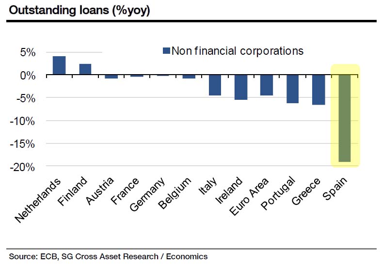 Il perché sta nelle cifre. La massa monetaria M3 è aumentata di 15 miliardi di euro in aprile, una correzione tecnica dovuta al calo del mese precedente innescato dalla crisi cipriota. Un dato benigno per i keynesiani, ma che continua a mostrarci una crescita a passo troppo lento e con un rovescio della medaglia molto preoccupante: dal punto di vista del credito, non c’è alcun segnale di miglioramento. Anzi, la concessione di credito al settore privato dell’eurozona si è contratta di un ulteriore 0,9%, dallo 0,7% di marzo, dato annualizzato. Ma le cose vanno ancora peggio nell’Europa periferica, soprattutto in Spagna appunto. Dove i prestiti verso aziende non del settore finanziario si sono contratti del 19,1%, come ci mostra questo grafico, e non ci sono particolari speranze per un’inversione di tendenza, visto che al netto delle promesse politiche, la fiducia resta a zero viste le prospettiva buie a livelli di crescita e ripresa.