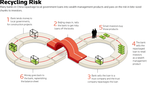 Il primo passo è rappresentato dalle banche che prestano denaro ai governi locali per progetti infrastrutturali, subito dopo la Banca centrale entra nel gioco e dice alla banca di levare quei prestiti rischiosi dal bilancio. Terzo step, la banca vende quel prestito a un trust che lo re-impacchetta e una volta fatta questa operazione la banca vende il prestito re-impacchettato alla clientela retail come strumento di risparmio gestito. Il piccolo investitore ci casca e compra il prodotto, di modo che il sesto e ultimo step vede la banca re-incassare il denaro attraverso la vendita e con questo ripianare il bilancio.
