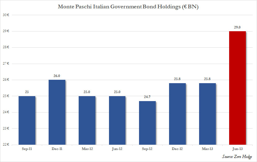 P.S.: Ieri abbiamo scoperto, attraverso il sindaco di Siena, che ci sarebbe l’interesse di soggetti esteri per Monte dei Paschi (alla faccia della politica che deve stare fuori dalle questioni bancarie), che il ceo di Mps, Fabrizio Viola, si è detto pronto a cambiare il piano di riassetto e attende le indicazioni di Bruxelles sui Monti-bond, ma soprattutto che l’istituto senese non può fallire. E sapete perché? Basta leggere il rendiconto di bilancio reso noto mercoledì per scoprire che la banca di Rocca Salimbeni nel solo secondo trimestre di quest’anno ha comprato titoli di Stato italiani per 3 miliardi di euro e che le sue detenzioni di debito governativo sono oggi al massimo storico, 29 miliardi di euro, come ci dimostra il grafico qui sotto. Che Dio ci aiuti.