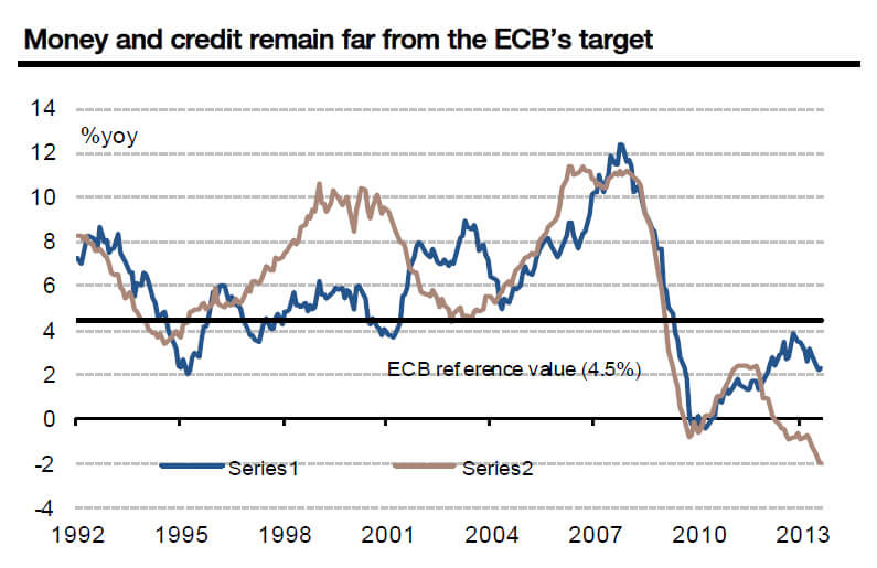 Draghi sa che finora ha scherzato con il fuoco e gli è sempre andata bene ma per quanto, visto cosa ci dimostra il secondo grafico a fondo pagina? Il meccanismo di trasmissione del credito nell’eurozona è completamente rotto, non più solo intasato. Il credito al settore privato è sceso ancora del 2% rispetto allo stesso periodo dello scorso anno, il sedicesimo calo di fila e il più grande dall’introduzione dell’euro nel 1999. Keynesianamente parlando, in un mondo dove solo il credito genera crescita, o Draghi si decide a stampare, aumentando la massa monetaria M3 e sfidando apertamente i dogmi inflattivi della Bundesbank o l’eurozona, semplicemente, imploderà. Come può esserci ripresa se al settore privato sono stati drenati via altri 8 miliardi di euro dal sistema? È impossibile, punto. I prestiti a soggetti non finanziari sono crollati di 11 miliardi in agosto (-2,9% anno su anno), dopo i cali di 19 miliardi in luglio (-2,1% anno su anno) e di 12 miliardi a giugno (-2,3% anno su anno): con numeri simili, vedete ancora la ripresa nel terzo trimestre di quest’anno? O nel quarto?