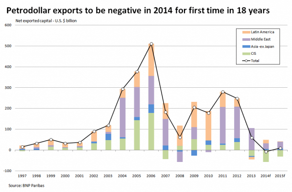 Certo, la macro-economia ci dice che la domanda potrebbe essere stimolata proprio dal calo del prezzo del greggio nelle economie importatrici di petrolio, poiché consumatori e imprese beneficeranno della forte riduzione dei costi dell’energia che alimenterà i consumi e contribuirà a ridurre il debito. Verissimo, ma c’è anche il rovescio della medaglia di cui vi parlo da settimane, ovvero il fatto che diminuirà l’avanzo positivo dei produttori di petrolio, quindi un calo dei flussi di capitale provenienti da paesi come la Russia e il Medio Oriente, i quali appunto già oggi per la prima volta in venti anni stanno trenando denaro dal ciclo del petrodollaro, come ci mostra il grafico a fondo pagina. Certo, al contrario gli importatori di petrolio in Asia, come Cina e Giappone, vedrebbero aumentare l’avanzo delle partite correnti grazie al calo dei costi per l’importazione di petrolio, il che – a fronte delle dinamiche demografiche – vedrebbe il rapporto tra risparmi globali e investimenti probabilmente poco invariato. Ma con la Cina che rallenta e fa i conti che la sua bolla del credito, meditando svalutazioni competitive dello yuan fino al 20% e il Giappone che nonostante tutto ha visto il tasso di inflazione cominciare a scendere un’altra volta, come si può sperare di innescare crescita?