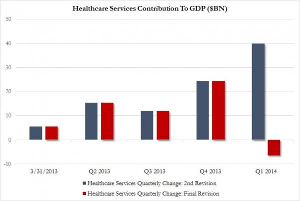 Eh già, peccato due piccoli particolari: uno, il già citato settore dello shale gas e oil, fino a oggi vero e proprio traino occupazionale e produttivo e le dinamiche del prezzo del petrolio che potrebbero impattare su di esso. Due, la solita propensione degli statunitensi alla finanza creativa stile Fausto Tonna quando si tratta di dati macro. Come avete appena letto, la sola spesa sanitaria ha contribuito per mezzo punto percentuale alla crescita del Pil americano. Bene, lo scorso giugno quando uscì il dato finale sul primo trimestre dell’anno, scoprimmo qualcosa di strano, ovvero che senza il programma di spesa sanitaria Obamacare, il dato di crescita per i primi tre mesi dell’anno sarebbe stato negativo. Peccato che quella rivisitazione al ribasso del contributo di Obamacare fu fatta apposta per ridurre il dato del PIl del primo trimestre sulle stime flash e fu una revisione quasi senza precedenti, come ci mostra il grafico a fondo pagina. Cos’ha quindi fatto il Dipartimento del Commercio Usa, siccome il primo trimestre fu un fiasco a livello di dato di crescita? Ha rimosso la spesa sanitaria per Obamacare come voce di contributo e l’ha spalmata sugli altre tre trimestri dell’anno, qualcosa come 40 miliardi di dollari.