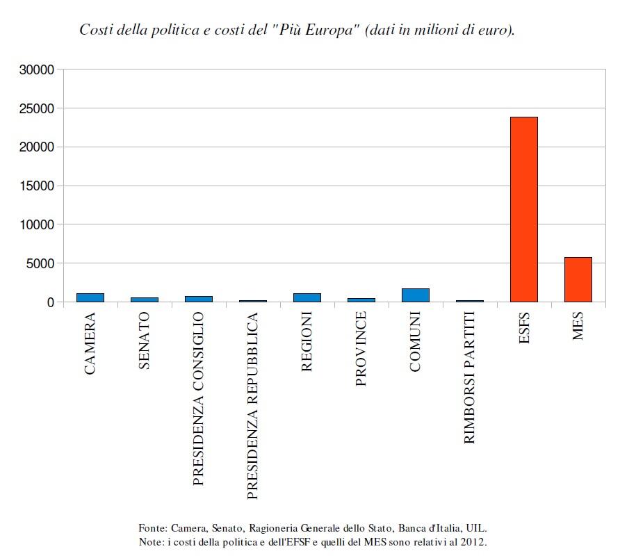 Dunque, Draghi non fa nulla se non vigilare e minacciare il famoso bazooka, quello scaricato ex ante dalla Corte costituzionale tedesca, mentre il ministro Padoan preannuncia di fatto il nostro commissariamento e l’esecuzione pedissequa dei diktat europei, salvo sparare cifre a caso sulla cosa più importante, ovvero le coperture delle manovre prospettate ai partner europei. Io avrei una ricetta migliore e ve la enuncio riproponendovi un grafico già pubblicato la settimana scorsa, rispetto i reali costi sostenuti dallo Stato italiano, con cifre al dicembre 2012: e se per rimetterci in carreggiata mandassimo a quel Paese l’Europa e i suoi fondi di salvataggio, che noi a differenza degli altri Pigs non abbiamo mai usato e mai useremo, visto che in caso di default o ristrutturazione siamo troppo grandi per essere salvati? Altro che dare 11 miliardi in due anni ai terroristi prezzolati e alleati con la Banca dei regolamenti internazionali e il Fmi che hanno preso il potere a Kiev…