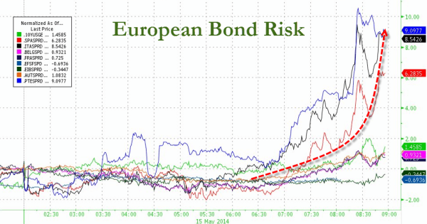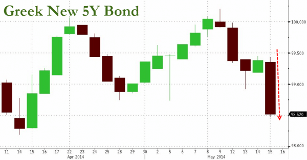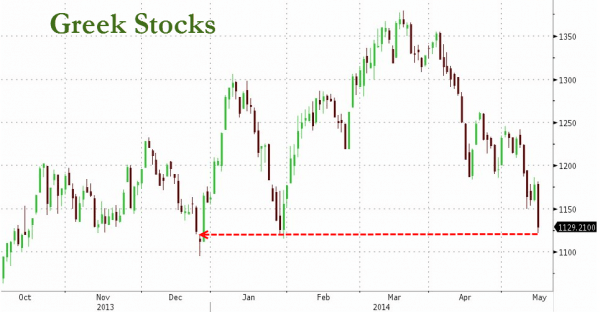P.S.: Vi ricordate quando vi dissi che la Grecia era tutt’altro che salva, nonostante i nuovi aiuti (serviti a ripagare i debiti con gli obbligazionisti) e che prima dell’estate sarebbe tornata a farsi sentire? Detto fatto, l’instabilità politica, il rischio di elezioni anticipate – con Syriza in pole position – e la tassa retroattiva sul capital gain ottenuto da entità e soggetti esteri operanti sul debito greco (33% nel primo caso, 20% nel secondo) nel periodo tra 29 febbraio 2012 al 31 dicembre 2013 hanno fatto sì che ieri la Borsa di Atene crollasse, così come il prezzo del nuovo bond a 5 anni (quello che aveva fatto impazzire tutto il parco buoi globale) e gli spread periferici europei vivessero la peggior giornata da un anno a questa parte, Italia compresa, come dimostrano questi grafici.
