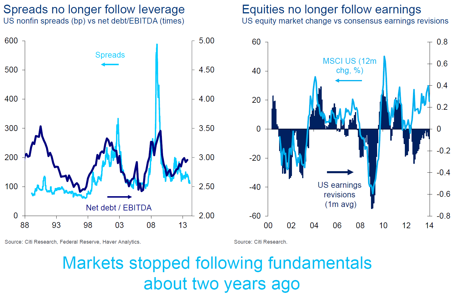 Pensate che la mia teoria sia troppo complottista? Guardate questo grafico: nonostante la Yellen, parlando mercoledì davanti al Congresso, abbia detto che non vi siano evidenze della presenza di bolle nel mercato, non vi pare che qualche distorsione invece ci sia, se i mercati hanno smesso di seguire i fondamentali circa due anni fa, soprattutto gli spread che hanno smesso di seguire, anzi hanno invertito la rotta, rispetto all’esposizione alla leva? Come vi dico da tempo, stiamo entrando in un nuovo 2008: ma se stavolta salta, salta tutto davvero. E lorsignori ci tengono troppo sia ai soldi, ma soprattutto al potere, al mantenimento della finanza come deus ex machina delle decisioni politiche a livello globale. Il timing della crisi ucraina, d’altronde, è lì a dimostrarcelo plasticamente.