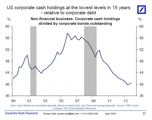 Molto netto il giudizio e molto chiaro il contenuto: il livello di prestiti e leasing concessi negli Usa sta salendo e molto, ma questo non deve essere visto come la riprova di una ripresa economica. Il perché è presto detto: «Molta parte dei prestiti al ramo corporate serve per finanziare bonus e dividendi agli azionisti, acquisizioni finanziarie (buybacks) e a dare impulso al mercato interno del boom energetico (investimenti per 200 miliardi di dollari nel settore quest’anno, grazie allo shale gas, ndr) e non per supportare la crescita organica delle aziende». Ora, guardate i due grafici a fondo pagina: ci mostrano plasticamente due cose. La prima è che se il debito netto è ai livelli massimi nel ramo corporate, l’accantonamento di fondi cash è ai minimi. La seconda è che nonostante tutti i rischi derivanti da questa attività, i prestiti bancari al ramo corporate – dopo anni di linea piatta – hanno ricominciato a crescere.