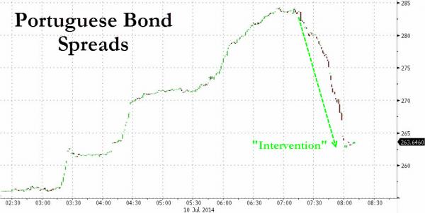 Pare di no, se come dimostra questo grafico, ieri la Bce è dovuta intervenire con il badile sul mercato secondario per tenere in carreggiata il debito sovrano portoghese, svenduto come ai tempi quando i fondamentali ancora contavano qualcosa. Attenzione, l’orologio del mercato ormai è rotto completamente, anche se due volte al giorno segna l’ora esatta. E se ieri l’oro ha rotto il punto di resistenza a 1334 dollari l’oncia non è solo perché Israele si prepara all’offensiva di terra a Gaza: pesa – e parecchio – anche il destino della cosiddetta “periferia” dell’eurozona. Ora Mario Draghi ha davvero le spalle al muro.