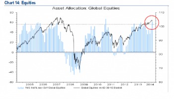 Ormai i dubbi tra gli investitori sono davvero pochi: stiamo entrando nella fase di pre-esplosione di una fine ciclo sui mercati equity. A confermarlo, ieri, il sondaggio mensile di Bank of America-Merrill Lynch tra i manager di fondi a livello mondiale, il quale ci mostra come gli investitori abbiano raggiunto il secondo livello più alto in tredici anni per quanto riguarda l’allocazioni di capitali nel mercato azionario, a quota 61%, come ci mostra il grafico.