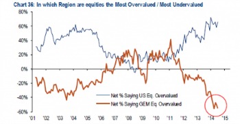 Ora, direte voi, se i tre quarti degli economisti pensano che l’economia globale si rafforzerà da qui al prossimo anno, qualche motivo ci sarà? Sicuramente, peccato che sia lo stesso motivo che li ha portati a certificare la loro certezza ad ogni sondaggio negli ultimi diciotto mesi: dati a suffraggio, zero. Tanto più che il Fondo Monetario Internazionale, tanto per cambiare, si è visto costretto a tagliare le proprie previsioni di crescita a livello globale al 3% per quanto riguarda il 2013, visto il rallentamento pesante della Cina e quello meno marcato ma sensibile di Russia, Brasile, India e Messico: metteteci l’eurozona che non solo non riparte ma continua a inviare segnali macro tutt’altro che confortanti, con le aggravanti di mine antiuomo tipo Banco Espirito Santo pronte a far esplodere gli spread e capite che da stare allegri c’è ben poco. Altro ottimismo forse mal riposto è quello riguardo l’inflazione, con il 71% degli interpellati da Bank of America sicuri che questa si impennerà, la percentuale più alta da marzo 2011: quando presero una sonora cantonata. In questo scenario, la banca d’affari raccomanda ai clienti (players navigati in questo caso, non impiegati che vogliono far fruttare i risparmi, sia ben chiaro) quattro trades contrarian: andare lunghi sui bonds e short sulle equities, lunghi sul dollaro e corti sulla sterlina, lunghi sulle telecomunicazioni e short sull’energia e infine long sui mercati emergenti e, udite udite, short sull’eurozona. Accidenti ma la crisi non era finita? Non eravamo in ripresa? Non potevamo vantare spread da fare invidia alla Svizzera? Certo, a Bank of America possono sbagliarsi come hanno già fatto in passato (il dato sul margine di profitto reso noto ieri lo conferma, anche se mascherato da perdite legate alle spese legali) ma qualcosa si sta muovendo sottotraccia se sempre più investitori ritengono che oggi i mercati emergenti siano più sottovalutati di quanto non fossero nel pieno della crisi Lehman, come ci mostra questo grafico: