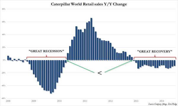 Non c’è che dire, la ripresa a livello globale è davvero in atto. Come sapete, utilizzo indicatori poco ortodossi per valutare quanto siano veritiere le dichiarazioni di regolatori e organismi internazionali riguardo la stato di salute dell’economia, una in particolare è il dato di vendite a livello mondiale di Caterpillar, il numero uno per quanto riguarda i macchinari per l’edilizia e l’industria in genere. Bene, dall’ottobre del 2008, un mese dopo il crollo Lehman e l’inizio della recessione, Caterpillar ha conosciuto 19 cali consecutivi nelle vendite a livello globale, un tonfo terminato solo nel maggio 2010, giusto in tempo per festeggiare il collasso greco e il default. Bene, quel record no è più tale, come ci mostra il primo grafico: a luglio di quest’anno il gruppo industriale ha raggiunto il traguardo dei 20 cali consecutivi, cominciati nel dicembre 2012 con un -1%, mentre un mese fa il crollo è stato, rispetto al luglio del 2013, del 9%.