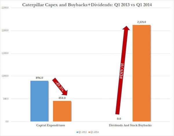 Davvero non male come sintomo di ripresa. Ma siccome viviamo in un mondo sconnesso dai fondamentali e dopato dai soldi facili delle banche centrali, in Borsa il titolo Caterpillar sta flirtando con i massimi di sempre. Come’è possibile, 20 cali consecutivi e la gente si scapicolla a comprare azioni? No, come ci mostra il secondo grafico, anche Caterpillar sta seguendo l’esempio di molte altre grandi aziende quotate, lanciandosi in un furioso buyback dei propri titoli. Anzi, più il titolo sale, più Caterpillar compra, un po’ indebitandosi con banche e attraverso emissioni obbligazionarie e un po’ utilizzando i programmi della Fed, come lo Zirp.