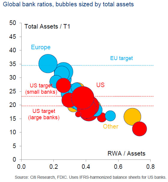 In parole povere, cosa ci dicono dal G20? Nulla più del fatto che nonostante i 2,8 triliardi di dollari di riserve in eccesso garantiti dalla Fed equamente a banche statunitensi ed europee, questo cuscinetto di sicurezza non è già più sufficiente e nonostante i ritardi nell’applicazione delle regole di Basilea III e delle sue più stringenti regolamentazioni sul capitale, a oggi i buffer presenti nei bilanci delle principali banche mondiali non sono affatto in grado di reggere l’urto di una nuova crisi di sistema, come ci mostra il secondo grafico. Ecco quindi la geniale intuizione del G20, presentata sotto l’acronimo di Glac, ovvero “Gone concern loss absortion capacity”, essenziale per tramutare i 29 principali istituti del mondo in soggetti gestibili e non più in “too big to fail”.