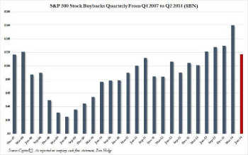 Come volevasi dimostrare, il bluff di Draghi e del suo piano di acquisti sta perdendo appeal non solo in Borsa ma anche sui mercati dei cambi valutari, con il cross euro/dollaro già tornato in area 1,30 dopo aver toccato il punto di supporto di 1,28 che aveva fatto gridare tutti al miracolo. Regge solo la tregua dello spread, con il Tesoro italiano che ieri ha visto rendimenti in ulteriore calo su tutte le scadenze: questo nel giorno in cui la Bce ci metteva in guardia dal rischio di non centrare l’obiettivo di deficit a causa delle crescita eufemisticamente definita “lenta”, ma tant’è. Anche Wall Street comincia a perdere slancio, per almeno un paio di motivi. Primo, la festa dei buybacks azionari da parte delle grandi aziende sta finendo, come ci dimostra questo grafico: