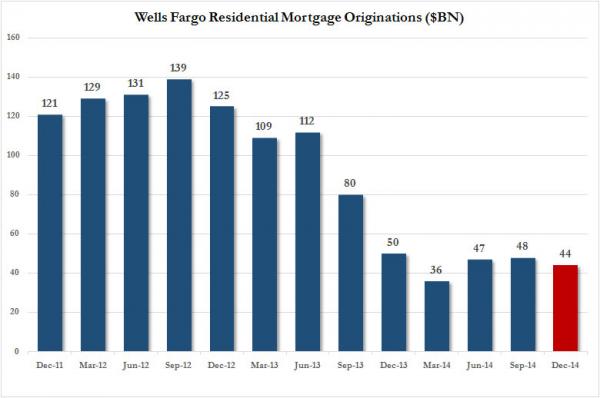 Bene, stando a dati della Mba statunitense, nella settimana terminata il 9 gennaio il numero di richieste di mutuo negli Usa era salito del 49,1%, di fatto un segnale di salute enorme per uno dei settori strategici dell’economia statunitense, l’immobiliare. Peccato che quei dati fossero legati a dinamiche meramente stagionali, mentre quando si vanno a vedere le cifre reali gli effetti del Qe sul comparto real estate siano un po’ diversi. E a confermarcelo è il principale generatore di mutui del Paese, Wells Fargo, e il primo grafico a fondo pagina parla più di mille parole: dopo essere sceso al minimo record di 36 miliardi nel primo trimestre del 2014, il numero di nuovi mutui originati è cresciuto, salvo però crollare nel quarto trimestre dello scorso anno, un risultato che è il secondo peggiore di sempre. E la cosa più interessante è che la stessa Wells Fargo, presentando il dato, ha dichiarato che le aspettative per il primo trimestre del 2015 sono simili a quelle dell’ultimo del 2014: insomma, un flop in uno dei settori chiave.