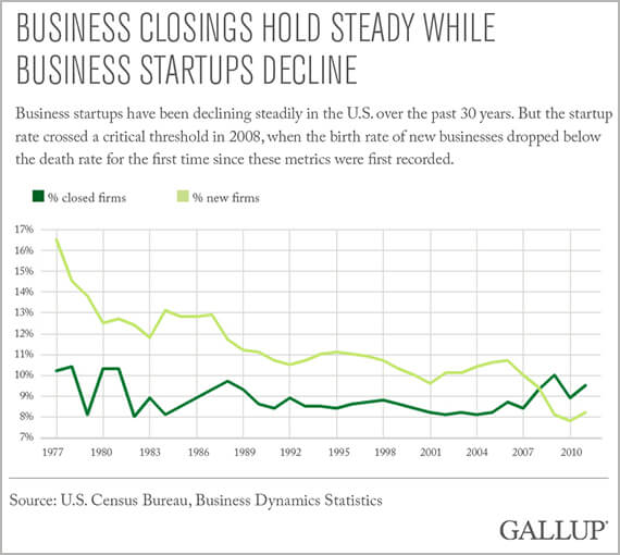 Ma andiamo avanti ed entriamo proprio nel più puro spirito americano, l’american dream della libera impresa e facciamolo sfatando da subito un mito: gli Usa sono dodicesimi nel ranking del mondo sviluppato in termini di attività delle start-up, dietro paesi come Ungheria, Danimarca, Finlandia, Nuova Zelanda, Israele, Svezia e persino la nostra tanto vituperata Italia. Non lo dice il sottoscritto ma Gallup, il più importante istituto demoscopico d’Oltreoceano, il quale due giorni fa ha certificato quanto segue: per la prima volta in 35 anni, ci sono state più chiusure che aperture di attività commerciali. Il Census Bureau statunitense, infatti, ha dovuto ammettere che per la prima volta da quando viene tracciato il dato, le start-up di nuove aziende e le chiusure di aziende già esistenti hanno varcato il Rubicone del trend negativo: per 400mila nuovi business nati annualmente, quelli falliti sono stati 470mila, come ci mostra il secondo grafico.