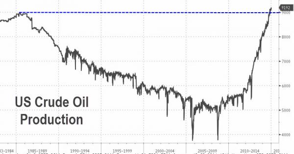 E qui occorre fare molta attenzione, perché tra alcune verità, l’Opec racconta anche parecchie bugie a fini strategici, visto che è di mercoledì il dato in base al quale le scorte di crude negli Usa sono cresciute di 5,39 milioni di barili, contro l’attesa di soli 1,75 milioni di barili e un calo lo scorso mese di addirittura 3,062 milioni di barili. L’Opec dice il falso, perché come ci mostra questo grafico, la produzione di US crude non presenta alcun segnale di rallentamento e, anzi, la scorsa settimana gli Usa hanno prodotto qualcosa come 9,19 milioni di barili al giorno, record assoluto dal 1983, anno in cui si cominciò a tracciare il dato.