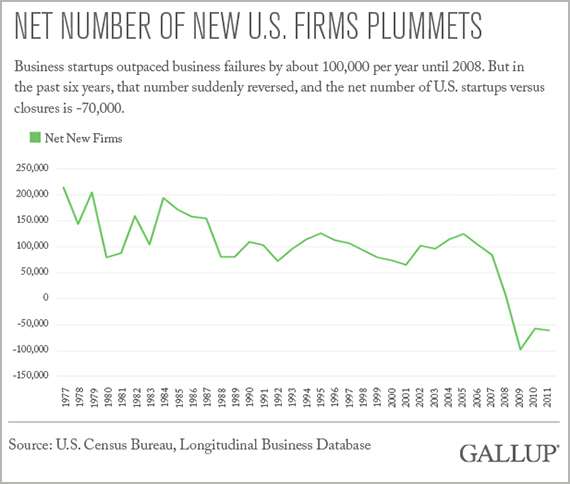 Ma andiamo avanti ed entriamo proprio nel più puro spirito americano, l’american dream della libera impresa e facciamolo sfatando da subito un mito: gli Usa sono dodicesimi nel ranking del mondo sviluppato in termini di attività delle start-up, dietro paesi come Ungheria, Danimarca, Finlandia, Nuova Zelanda, Israele, Svezia e persino la nostra tanto vituperata Italia. Non lo dice il sottoscritto ma Gallup, il più importante istituto demoscopico d’Oltreoceano, il quale due giorni fa ha certificato quanto segue: per la prima volta in 35 anni, ci sono state più chiusure che aperture di attività commerciali. Il Census Bureau statunitense, infatti, ha dovuto ammettere che per la prima volta da quando viene tracciato il dato, le start-up di nuove aziende e le chiusure di aziende già esistenti hanno varcato il Rubicone del trend negativo: per 400mila nuovi business nati annualmente, quelli falliti sono stati 470mila, come ci mostra il secondo grafico.