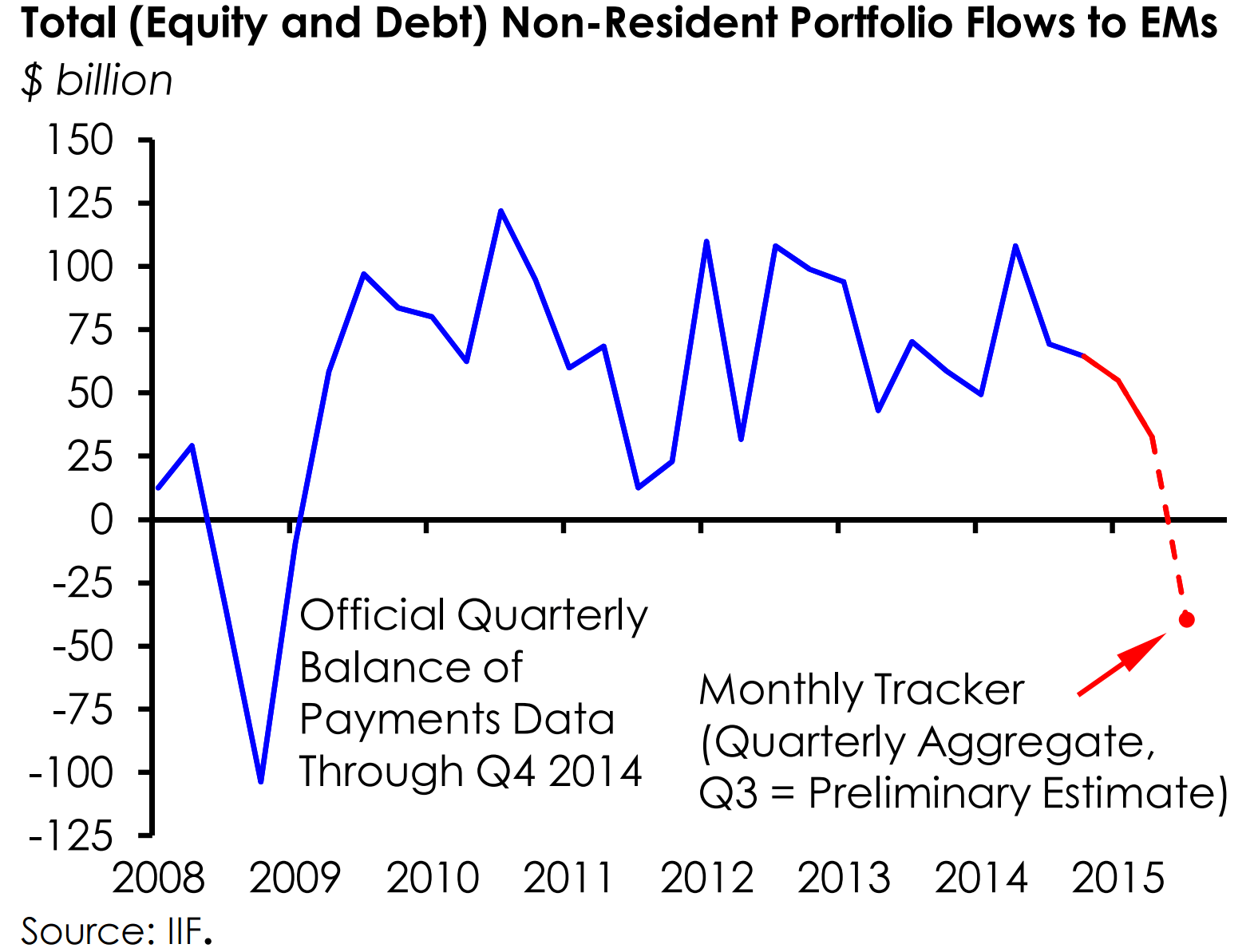 Stando a dati dell’Iif, questo outflow trimestrale è il maggiore dal 2009 e il secondo dopo quello dell’ultimo trimestre del 2008, quando i traders vendettero assets per un controvalore di 105 miliardi di dollari. Alla base della crisi, il combinato di tre ragioni: il rallentamento dell’economia cinese, il crollo dei prezzi delle materie prime e la minaccia della Fed di alzare di tassi di interesse, essendo queste nazioni pesantemente indebitate in dollari. La composizione dell’outflow ha visto una sell-off di equities che ha pesato per 19 miliardi, mentre gli altri 21 sono stati in debito: inoltre, gli emergenti hanno registrato fughe di capitali fin da inizio anno a ogni trimestre. L’indice benchmark Msci Emerging Markets negli ultimi tre mesi ha perso il 20%, un china che potrebbe portarlo quest’anno al più grande ritracciamento dal 2011, mentre i bond denominati in valute locali hanno perso il 6,6% in termini di dollari nel quarto trimestre, stando a dati di Bank of America e le valute di tutti i Paesi, dalla Brasile al Sudafrica, sono crollate.