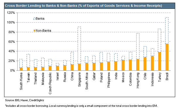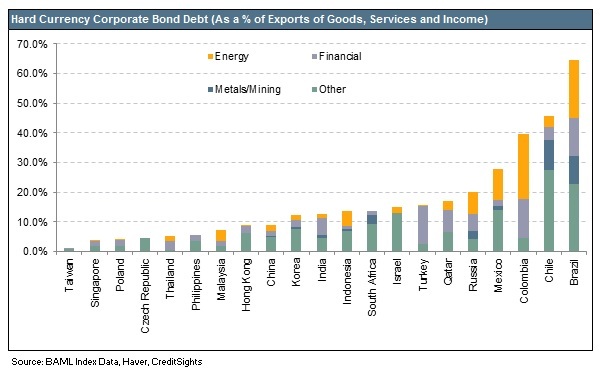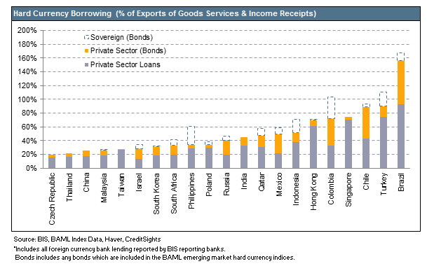 In un scenario simile, ecco arrivare poi le prospettive ancora più nere, forniteci da CreditSights che ha analizzato i dati sui prestiti cross-border della Bri e il dato degli indici dei bond corporate di Bank of America per cercare di stimare e mettere in prospettiva la situazione debitoria in valute estere dei mercati emergenti. Il secondo grafico a fondo pagina, ci mostra il dato del prestito cross-border posto in paragone con un’entrata in valuta estera delle varie nazioni, ad esempio l’export. Passiamo dal 6% della Corea del Sud a qualcosa come 56% per il Brasile! Il terzo grafico, invece, ci mostra l’indice del comparto obbligazionario corporate dei mercati emergenti come percentuale delle revenue in valuta estera: guarda caso, domina ancora il Brasile, con le compagnie energetiche che hanno emesso debito in valute straniere con il badile e ora rischiano il default per il crollo dei pezzi. Infine, il quarto grafico combina il prestito cross-border, i corporate bonds in valuta estera e il debito governativo, mostrando il grado di dipendenza di ogni Paese dal prestito in valute estere forti. Ancora il Brasile in testa, poi Turchia e Colombia.