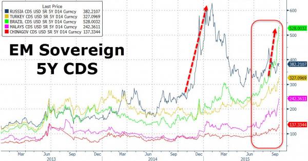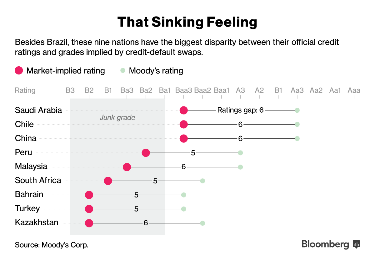 Insomma, guai seri già oggi che potrebbero peggiorare se la Fed alzasse davvero i tassi entro fine anno come ha dichiarato la scorsa settimana Janet Yellen. E con i credit default swaps di questi Paesi saliti alle stelle, come ci mostra il primo grafico a fondo pagina, il rischio è che molte di queste nazioni, se la situazione non migliorerà e in fretta, si vedranno scaraventate nella categoria di rating “junk”, visto che come ci mostra l’ultimo grafico sono nove le nazioni che già oggi esprimono un’enorme discrepanza tra il loro rating di credit ufficiale e quello espresso implicitamente dal valore dei loro credit default swaps, stando a un modello utilizzato da Moody’s.