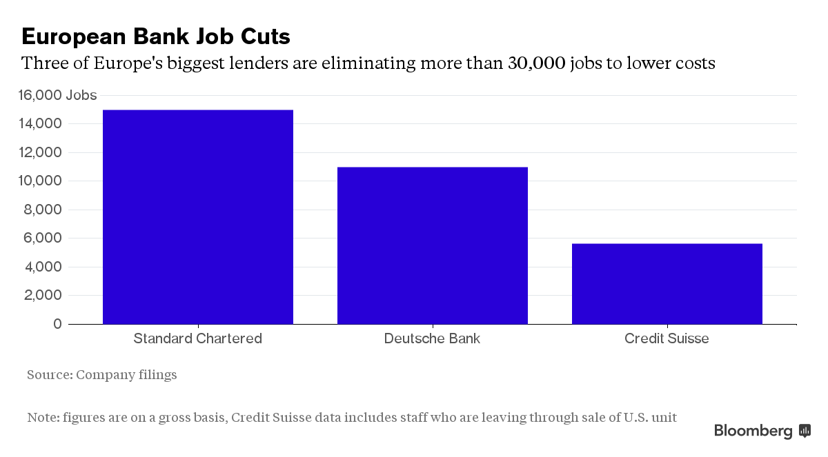Cosa succede al sistema bancario europeo? Questo, ovvero ciò che ci mostra il grafico a fondo pagina: l’altro giorno Standard Chartered è divenuta la terza banca del Vecchio continente in meno di due settimane ad annunciare tagli occupazionali, portando il totale combinato dei licenziamenti a 30mila unità, circa 1 ogni 7 posizioni. La banca inglese eliminerà 15mila unità di personale, il 17% della forza lavoro, a fronte di sofferenze sui prestiti ai mercati emergenti che stanno andando a intaccare gli utili, mentre Deutsche Bank ha già annunciato tagli per 11mila unità e Credit Suisse per 6500. Non stiamo parlando del Credito Cooperativo di Codazzo ma di veri e propri colossi del credito. Di più, se Deutsche Bank ha eliminato il dividendo per quest’anno e per il prossimo a fronte degli oltre 6 miliardi di euro di perdite nel terzo trimestre, sia Standard Chartered che Credit Suisse opereranno un aumento di capitale.