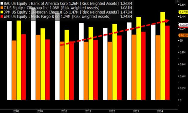 Le banche interessate sono quelle messe in revisione da S&P’s più Bank of New York e per sei di loro l’impatto collettivo sarà di 120 miliardi di dollari fra Tlac e Ltd, con quest’ultima voce che peserà da sola per circa 90 miliardi di dollari. Peccato che il grafico a fondo pagina ci mostri come tutte loro abbiamo visto crescere i propri assets ponderati al rischio dal 2008 in poi. Insomma, per questa ragione – ovvero il non poter più fattorizzare il supporto straordinario della Fed nei ratings – Standard&Poor’s ha deciso di risolvere la questione del cosiddetto creditwatch per le 8 big entro l’inizio di dicembre, emanando le sue decisioni su eventuali downgrade. Stranamente, proprio prima della riunione del Fmoc attesa per il 16 dicembre e che per sempre più persone potrebbe portare il primo rialzo dei tassi dopo 83 mesi schiantati a zero.