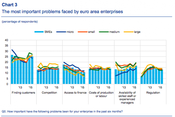 Prima di entrare nel cuore dell’articolo, mi preme parlare brevemente di un fatto che non ho visto riportato da nessun mezzo di comunicazione, pur arrivando da fonte più che ufficiale. Si tratta, infatti, del sondaggio condotto tra aprile e settembre di quest’anno dalla Bce riguardo le condizioni di finanziamento per le piccole e medie imprese nell’area euro, i cui risultati sono stati resi noti la scorsa settimana. Il dossier è ovviamente molto dettagliato, ma è una la criticità che emerge immediatamente e che nessuno si aspetterebbe: come ci mostra il primo grafico a fondo pagina, il defibrillatore del Qe per cercare di rianimare l’economia è scarico, visto che per le piccole e medie imprese della zona euro il problema principale NON è l’accesso al credito ma trovare clienti. Di più, se questa criticità è la prima per il 25% degli interpellati (era il 26% nel corso del sondaggio precedente), l’accesso al finanziamento è addirittura l’ultima, con l’11%.