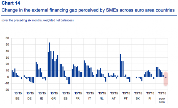 Essendo le Pmi la spina dorsale dell’economia europea, questo rappresenta un problema e serio. E la stessa Bce con il secondo grafico a fondo pagina ci mostra come il gap di finanziamento esterno, ovvero la differenza percepita dalle aziende tra la necessità di finanziamenti esterni e la disponibilità di quei fondi, sia tornato negativo per la prima volta dal 2009 nell’eurozona. E qui, sorgono due domande: quando la Bce capirà che se i soldi non arrivano nelle tasche dei cittadini, questi non spendono e quindi l’economia non riparte? Secondo, se c’è tutta quest’abbondanza di finanziamento, perché invece in Italia sempre più piccoli e medi imprenditori si lamentano per l’accessibilità del credito o i costi troppo elevati, nonostante i tassi a zero garantiti proprio dalla Bce? Non è che le nostre banche hanno molto il braccino corto verso le Pmi e invece sono di manica larga con i grandi gruppi di potere o quando si tratta di comprare Btp per far contento il governo?