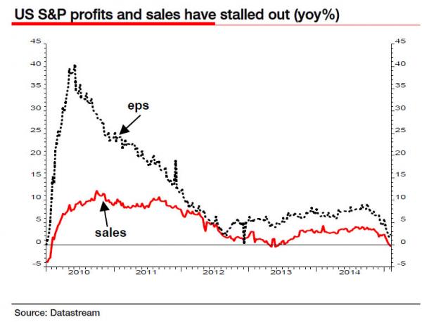 Insomma, formalmente sembrerebbe che l’unica detenzione sicura e con un rendimento siano i titoli azionari statunitensi, ma attenzione, perché a breve tutte le aziende che hanno proliferato grazie all’export garantito dal dollaro debole, subiranno perdite e in parte il processo è già in atto, ancorché non prezzato, visto che la guidance dell’87% delle aziende Usa quotate allo Standard&Poor’s per il 2015 è già stata rivista al ribasso. E con la Fed che può non ufficialmente operare solo qualche blitz, sono i profitti il vero driver dei titoli azionari e come vi ho dimostrato pochi giorni fa, i profitti negli Usa stanno crollando.