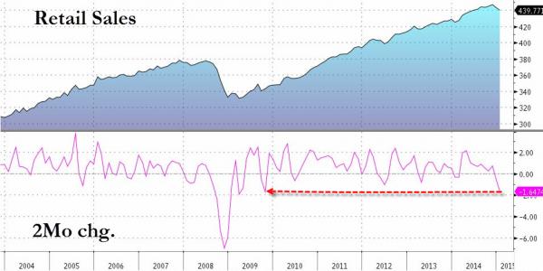 Non ci credete? Guardate il primo grafico a fondo pagina e vedete se vi dico bugie. E non solo loro stanno piantandosi al suolo, visto che sono di ieri due dati macro freschi freschi che ci sembrano dire chiaramente che il rialzo dei tassi da parte della Fed non ci sarà né a giugno, né a settembre, visto che come cerco di dimostravi da settimane, la ripresa Usa è solo un mito. Come ci mostra il secondo grafico, le vendite al dettaglio sono calate a gennaio dello 0,8%, dopo il -0,9% e contro le attese di un -0,4%, il peggior dato dall’ottobre 2009. E come se questo non bastasse, il dato chiave per i monitor della Fed ha fatto registrare un segnale d’allarme: le richieste iniziali di sussidio di disoccupazione a gennaio sono salite di 24mila unità – guarda caso circa il numero di dipendenti del comparto energetico che l’ultimo dato governativo sui nuovi posti di lavoro creati a gennaio non contemplava nel novero totale, che combinazione – rompendo quota 300mila, esattamente a 304mila e come è risaputo quel livello è la demarcazione tra il modus operandi del “è tutto a posto, l’economia vola” e quello del “niente è a posto, ci serva ancora un po’ di Qe”.