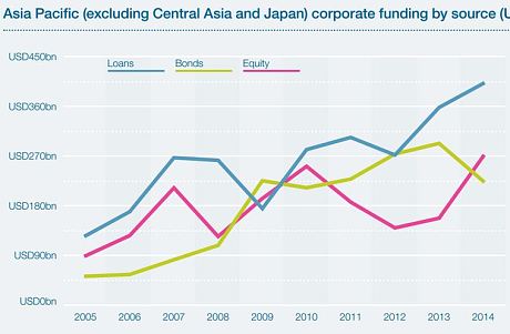 E tanto per tornare alla questione dollaro, il numero di triliardi di biglietti verdi presi in prestito da investitori e aziende a livello globale potrebbe essere molto più alto di quei 9 triliardi, poiché stando all’ultimo report della Allen&Overy di Londra, il finanziamento corporate lo scorso hanno ha toccato un nuovo record, con il dato combinato di prestiti, bond e equity che ha sorpassato i 6 triliardi di dollari per la prima volta nella storia, oltretutto escludendo le istituzioni finanziarie e i gruppi legati all’immobiliare! Nel computo, troviamo che la fornitura di prestiti per le aziende a livello mondiale a raggiunto i 4 triliardi di dollari, superando il picco pre-crisi e questo soprattutto nella ribollente Asia, come ci mostra il terzo grafico, mentre l’eurozona resta con il proprio dato sotto i massimi. Il finanziamento per il settore corporate nell’area Asia-Pacifico è infatti salito da 549 miliardi di dollari del 2007 agli 870 dello scorso anno, con gli investimento equity saliti nel 2014 del 71%. E se il dollaro continuerà a rafforzarsi e le valute asiatiche e degli altri emergenti continueranno a schiantarsi, cosa succederà a quella massa enorme di debito?