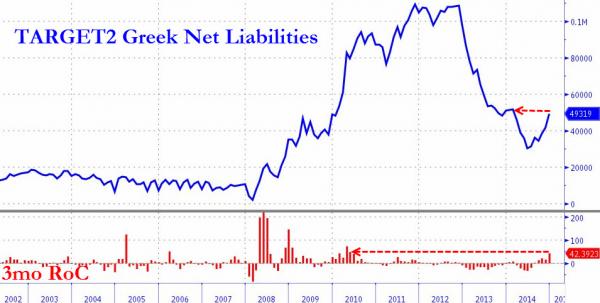 E a questo punto non so più cosa pensare, perché ieri Berlino ha alzato – e di molto – l’asticella dello scontro? Vuole umiliare Tsipras per dare una lezione a tutti gli altri membri Ue poco virtuosi? Vuole davvero l’addio della Grecia all’euro? Se anche banche d’affari come Citi ormai vedono la possibilità del cosiddetto “Grexit” salite dal 25% al 50%, forse conviene cominciare a pensarci davvero, a enumerare quell’ipotesi tra quelle probabili. Il problema è che se Atene viene spedita fuori dall’euro, la nazione non farà default solo sui soldi legati ai pacchetti di salvataggi ma anche sulle sue liabilities legate al programma Target2 della Bce, il bancomat delle Banche centrali europee, il quale in tempi normali vede gli aggiustamenti degli squilibri come di routine, automatici e auto-correttivi. Il problema è quando un’unione monetaria si rompe, visto che i debiti di Target2 detenuti dalla Bank of Greece presso la Bce sono saliti a 49 miliardi di euro a dicembre, come mostra il grafico a fondo pagina, per reazione alle prime fughe di capitali in vista del voto: oggi potremmo già essere tranquillamente a quota 65 miliardi, visto l’aumento spaventoso delle bank run.