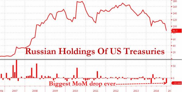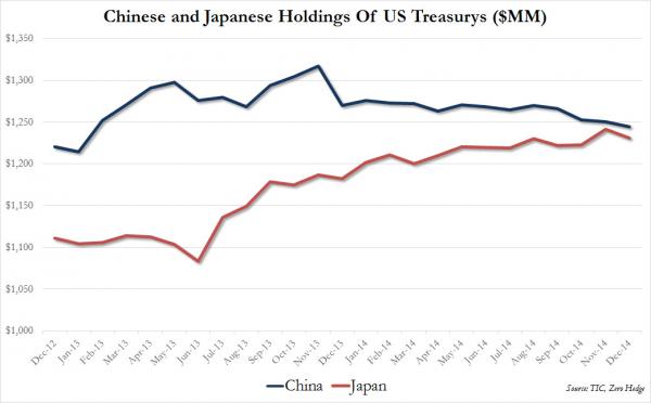 Insomma, la de-dollarizzazione russa comincia a diventare serie e rischia di far proseliti che vadano al di là degli scambi bilaterali con Cina e Iran utilizzando le proprie valute. E ci sono molti modi di de-dollarizzare un’economia, uno è quello rappresentato nel primo grafico a fondo pagina: la Russia a dicembre ha venduto 22 miliardi di debito Usa, il 20% di tutte le sue detenzioni totali, portandole a soli 86 miliardi di dollari, il livello più basso dal giugno 2008 e utilizzando quella liquidità per aumentare le riserve auree statali in vista del lancio del rublo gold-backed, ovvero legato e garantito dall’oro fisico. E come ci mostra il secondo grafico, Mosca non è stata la sola ad alleggerire le sue detenzioni di Treasuries Usa, visto che anche la Cina ha venduto altri 6 miliardi di dollari di titoli Usa a dicembre, portando le proprie detenzioni al livello del Giappone se Tokyo nello stesso mese non avesse venduto altri 10 miliardi di Treasuries. E con quella liquidità denominata in biglietti verdi, cosa avrà comprato Tokyo? Petrolio a basso costo per il suo progetto di riserva strategia? Questo sicuramente, ma forse anche oro, per rendere ancora più pingui le proprie già abbondanti riserve.