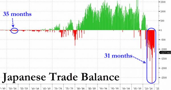 E volete anche quella giapponese? Pronti, ce la mostra l’ultimo grafico, stando al quale – al netto degli aggiustamenti stagionali – il bilancio commerciale giapponese (a causa del collasso annuale degli import al -9% e all’aumento del 17% dell’export) oggi poggia su un deficit da oltre un triliardo di yen: siamo al 31mo mese di fila, la striscia più lunga dal 1954. Ecco a voi le condizioni in cui sta l’economia globale dopo cinque anni di Banche centrali al timone: solo il comandante Schettino è riuscito a fare di peggio.