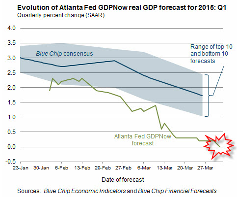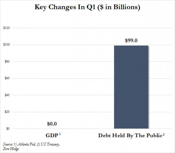 Insomma, nonostante i keynesiani amino – come certi anziani al bar quando parlano con gli amici – prendersela con il tempo infame, questa scusa non regge: se l’economia va male è a causa del crollo del prezzo del petrolio, del commercio mondiale e dei peggiori dati macro che gli Usa abbiano espresso dal crollo di Lehman Brothers a oggi. In compenso, in questi tre primi mesi dell’anno qualcosa è cresciuto negli Usa, come ci dimostra il primo grafico a fondo pagina: a fronte di un Pil a zero come dimostrato dall’indicatore GDPNow della Fed di Atlanta, infatti, gli Stati Uniti al 31 marzo hanno creato ben 100 nuovi miliardi di dollari di debito pubblico. Non male, davvero un applauso tonante per Obama.