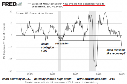 Ancora non vi basta? Ecco l’ultimo grafico a dimostrazione della mia tesi, ovvero che l’America è già oggi in recessione e rischia di sprofondarci ancora di più entro il terzo trimestre di quest’anno: con un dato dei nuovi ordinativi per beni di consumo simile, in calo al peggior livello dall’ultimo recessione, pensate che si possa parlare di ripresa senza meritarsi una sonora risata in faccia? Di più, è di ieri il dato il base al quale – nonostante il dollaro forte – il bilancio commerciale Usa si è schiantato: com’è possibile? Semplice, a gennaio le importazioni (con il delta interamente legato ai beni e non ai servizi) sono scese da 232 a 222 miliardi di dollari, un calo di 10 miliardi o il 4,4% che rappresenta la diminuzione peggiore dell’import Usa dal picco della crisi finanziaria seguita al crollo Lehman.