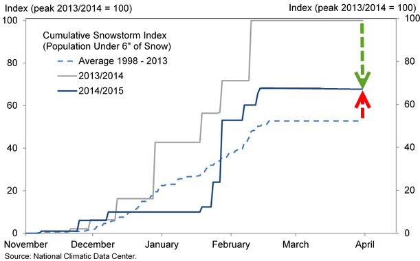 Forse perché quasi tutti caveat posti a difesa della narrativa ottimistica sono ridicoli e confutabili in pochi istanti: guardate il terzo grafico, al netto delle immagini di New York coperta di neve fino a pochi giorni fa e alle giustificazioni di Fed e banche d’affari per le cattive performance dell’economia legate alle cattive condizioni atmosferiche, proprio Goldman Sachs ci dimostra che quest’anno, nonostante la quantità di neve caduta sugli Usa sia stata superiore alla media degli ultimi 27 anni, è stata comunque inferiore del 30% rispetto a quella scesa lo scorso anno!