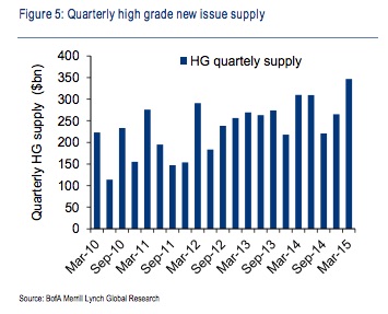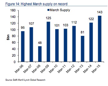 Insomma, le aziende lo sanno e temono che la festa stia per finire, quindi non solo il primo trimestre ha sancito un record per le emissioni, ma il solo mese di marzo, con 143 miliardi di dollari di controvalore, ha pareggiato il risultato raggiunto nel maggio 2008, pessimo precedente. Il totale per i primi tre mesi dell’anno ha visto emissioni per 348 miliardi di dollari, su dal record precedente di 310 miliardi stabilito nel primo trimestre dello scorso anno, con un volume giornaliero di 15,6 miliardi contro i 14,3 miliardi dello stesso periodo del 2014.