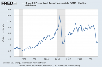 Stando al dato della FactSet, per il primo trimestre di quest’anno soltanto 16 aziende quotate sull’indice S&P’s 500 hanno presentato un guidance di ratio utile per azione positiva, contro 85 che l’hanno presentata negativa! Pensate che questo abbia scoraggiato gli investitori? No, perché la “fabbrica delle bolle” è capace di qualsiasi cosa grazie alla distorsione dei mercati consentita dalla Fed e infatti i titoli delle aziende con guidance negativa hanno visto un incremento medio dell’1,7%, il più alto aumento dal secondo trimestre del 2009! Ma andiamo avanti, perché a differenza dei soloni stile La Repubblica o Il Corriere della Sera, io le mie analisi le sostanzio che cifre, dati e grafici, non con l’ideologia e le percentuali dopate dei Dipartimenti federali. Come può l’America crescere a fronte di un prezzo del petrolio che ha patito questa dinamica, come ci mostra il quinto grafico?