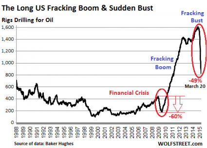 È proprio Wolf Richter, autore del grafico, ha commentarlo: «Nell’ultima settimana, i produttori hanno chiuso altri 41 impianti petroliferi, stando a dati della Baker Hughes. A oggi sono attivi solo 825 rigs, un calo del 48,7% rispetto al mese di ottobre scorso. Nelle ultime 23 settimane, i rigs chiusi sono stati 782, il numero maggiore nella storia, soprattutto per la velocità e l’effetto domino». E gli Stati a maggiore vocazione energetica, come il Texas, stanno già piangendo, visto che l’ultimo outlook legato al comparto manifatturiero parla per il mese di marzo di un -17,4 contro il -11,2 di febbraio, sintomo che le condizioni del business nello Stato stanno deteriorando e in fretta. E attenzione, perché la situazione è destinata a peggiorare parecchio e nel breve periodo, visto che stando a un report pubblicato ieri da Bloomberg, «banche e finanziarie stanno preparandosi a tagliare le linee di credito verso un gruppo di aziende dello shale oil con rating “junk” per almeno il 30% nei prossimi giorni», di fatto assestando un altro colpo terribile verso compagnie che stanno lottando con le unghie e con i denti per sopravvivere al crollo del prezzo del greggio.