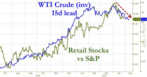 Fino allo scorso anno, le aziende del ramo retail quotate beneficiarono invece dell’afflusso di fondi giunti dai consumi, mentre ora quegli stessi titoli attraverso le loro underperformance ci dicono che la relazione è invertita. Insomma, dopo l’emorragia di posti di lavoro, i rischi di default sul debito high-yield emesso dai produttori di shale oil, i tagli del CapEx da parte delle major del settore, anche il driver dei consumi che si pensava potesse essere innescato dal basso costo dell’energia si è rivelato un’arma spuntata. In parole povere, il petrolio così basso è un problema per gli Usa: lo si risolve alzando i tassi?