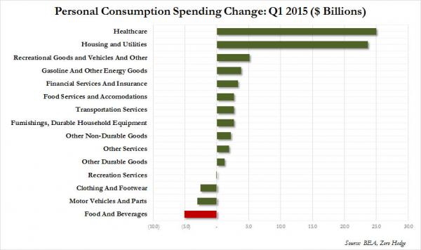 Veniamo ora all’inverno come causa di rallentamento dell’economia. Vi ho già dimostrato come quello del 2013 fu più freddo dello scorso, quindi già questo basterebbe a sbugiardare le scuse della Fed (e di tutti i quotidiani e telegiornali italiani che ieri l’hanno rilanciata stile cane di Pavlov), ma c’è di più e ce lo dice il primo grafico a fondo pagina, strettamente correlato al dato del Pil di mercoledì visto che ne offre le voci scorporate. Come negli ultimi mesi – e state certi che la cosa durerà ancora per molto – la prima voce di spesa rispetto ai servizi è la sanità, ovvero le spese obbligatorie legate al programma Obamacare che già hanno salvato con le loro revisioni il Pil del quarto trimestre 2014. Ma qual è la seconda? La spesa per “utility”, ovvero luce ma soprattutto riscaldamento delle abitazioni e degli uffici, quindi l’inverno rigido paradossalmente ha aiutato la crescita del Pil Usa attraverso l’aumento dei consumi da parte di tanti americani che per la neve e il gelo sono rimasti rintanati in casa, sul divano con le babbucce.