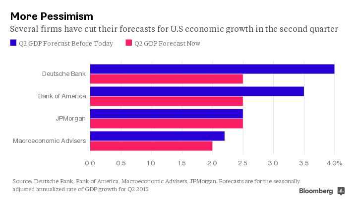 Insomma, le bugie hanno le gambe corte. La realtà, invece, è che in contemporanea con la pubblicazione del dato del Pil, sempre più soggetti hanno immediatamente rivisto al ribasso anche le stime per il secondo trimestre, come ci mostra il secondo grafico. Macroeconomic Advisers ha portato le proiezioni dal 2,2% al 2%, quando solo il 7 aprile pronosticava un “cinese” 2,8%. E proprio a causa dell’enorme dato delle scorte di magazzino di cui vi parlavo ieri, anche Deutsche Bank ha abbassato le stime, parlando ora di un secondo trimestre al 2,5% dal 4% iniziale, mentre Bank of America ha operato un downgrade dal 3,5% al 2,5% e JP Morgan ha lasciato invariato il dato al 2,5%, ma avendolo già tagliato dal 3% a marzo. Ma anche la Fed ora sarà costretta a rivedere un po’ le sue stime, visto che le proiezioni diffuse dopo il meeting di marzo parlavano di un’espansione dell’economia Usa quest’anno fra il 2,1% e il 3,1%, mentre la tendenza centrale (ovvero quella che esclude le prime tre e le ultime tre delle 17 proiezioni) parlava di un Pil tra il 2,3% e il 2,7% annualizzato.