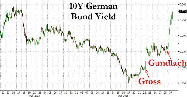 D’altronde, come vi ho già detto mille volte, i titoli tedeschi sono quelli che più di altri sono interessati dal fenomeno dei tassi negativi, un paradosso innescato dalla politica ultraespansiva della Bce per cui l’investitore, invece di incassare un rendimento, si trova di fatto a pagare una sorta di commissione per tenere in portafoglio un bond governativo. Guardate il primo grafico a fondo pagina, ci mostra l’andamento del rendimento del Bund a 10 anni dopo che Bill Gross di Janus Capital prima e Jeffrey Gundlach di DoubleLine Capital poi hanno fatto capire che la loro prossima mossa sarà quella di andare short proprio sul decennale teutonico.