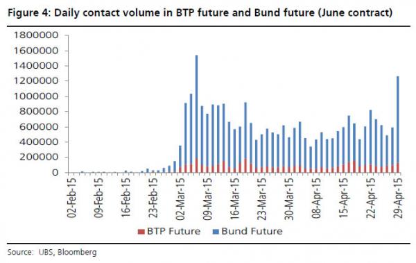 Io non mi sento affatto tranquillo per una situazione simile, anche perché come ci mostra il secondo grafico, i volumi in cui sono trattati i Bund rispetto ai Btp sono spaventosi. Tutte prese di beneficio su trades legati al Qe rivelatisi un successo? Un po’ prestino, vista la durata del Qe di Draghi: a meno che i professional non sappiano che questo è il momento di prendere la porta di uscita, onde evitare di rimanere schiacciati quando saranno in tanti a volere vendere carta e in plancia di comanda ci saranno però gli scommettitori al ribasso tipo Gross.