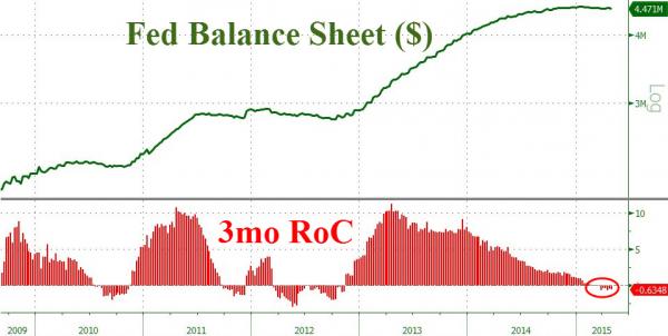 E perché lo fanno? Cominciamo. Guardate il primo grafico, il quale ci dimostra come il calo del bilancio della Fed sia proseguito nel mese di aprile, scendendo al 1 maggio a 4,47 triliardi di dollari, un’enormità ma comunque 45 miliardi in meno rispetto al picco raggiunto il 16 gennaio di quest’anno e al livello del 17 ottobre 2014. Solo negli ultimi tre mesi lo stato patrimoniale della Federal Reserve è calato di 29 miliardi di dollari e basandoci su un roll a tre mesi, il grafico ci mostra come lo stesso sia stato in calo negli ultimi due.