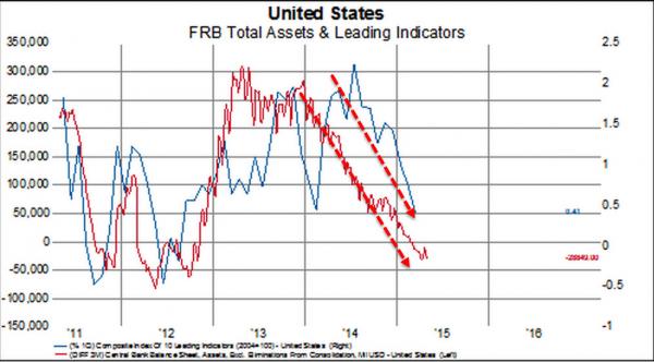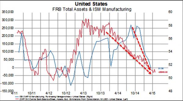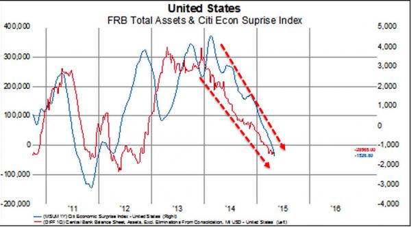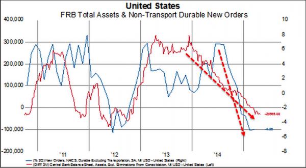 Bene, cosa ha comportato questo? Ora guardate gli altri quattro grafici e capirete: in concomitanza perfetta con il calo del bilancio della Fed, è crollato il Surprise Index di Citigroup (mai sceso a un ritmo simile e oggi solo marginalmente superiore alla lettura post-Lehman), il dato dei nuovi ordini di beni durevoli, l’indice manifatturiero Ism e i cosiddetti “leading indicators”, ovvero i principali indicatori macro. Capite ora perché la Fed non può permettersi di alzare i tassi, tantomeno a settembre ed è invece obbligata a trovare una scusa per dar vita a un nuovo ciclo di Qe?